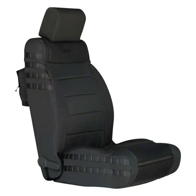 Aggressive Styling and Unmatched Comfort. These Bartact Tactical Series SRS Air Bag Compliant Front Seat Covers in Black improve the interior of your Jeep with remarkable comfort and a luxurious look. Their high-quality fabric is designed to provide a snug fit and trouble-free installation. And with their tactical design, these seat covers give your Jeep a battle-ready appeal like no other.