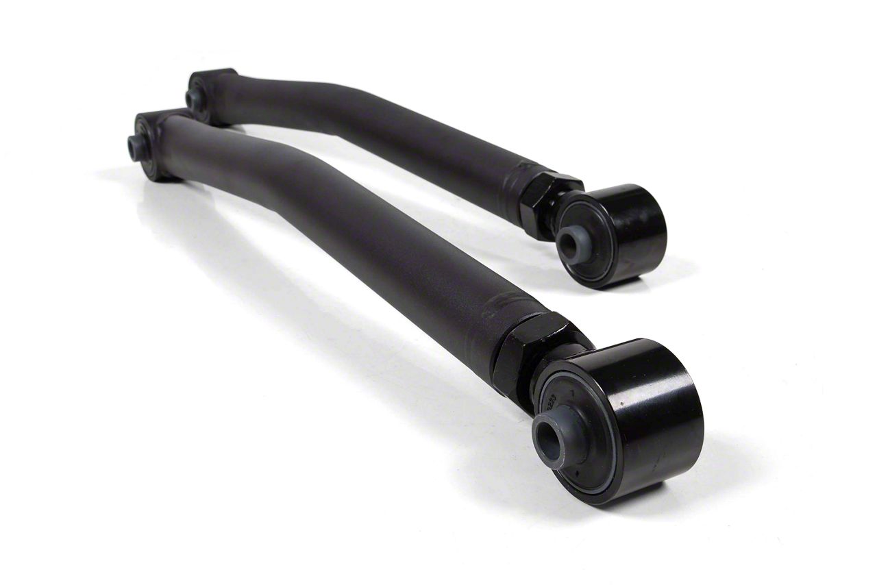 Construction and Appearance. Each arm is built from 1.9-inch outer diameter heavy wall steel tubing, fully welded and finished in a textured black powdercoat for long-term corrosion resistance. OE-style rubber bushings on the axle side ensure quiet performance, while the forged frame-end bushing delivers added durability. The adjustable design ensures correct axle placement across various lift heights.