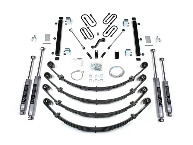 Construction and Features. This kit includes NX2 Nitro Performance Shocks, Glideride Leaf Springs, and U-bolts for enhanced suspension performance. The matte black, textured black, and metallic gray finishes ensure durability and style. The included brake lines, transfer case drop kit, and installation hardware provide everything needed for a seamless upgrade.