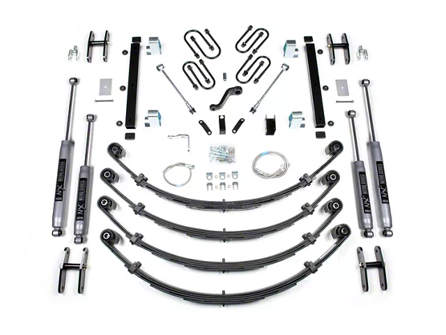 Construction and Features. This kit features Glideride leaf springs, NX2 Nitro performance shocks, and robust U-bolts to enhance your vehicle's stability and comfort. It also includes track bar relocation brackets, a transfer case drop kit, and installation hardware for a comprehensive suspension upgrade. The glossy black, textured black, and metallic gray finishes ensure long-lasting durability and style.
