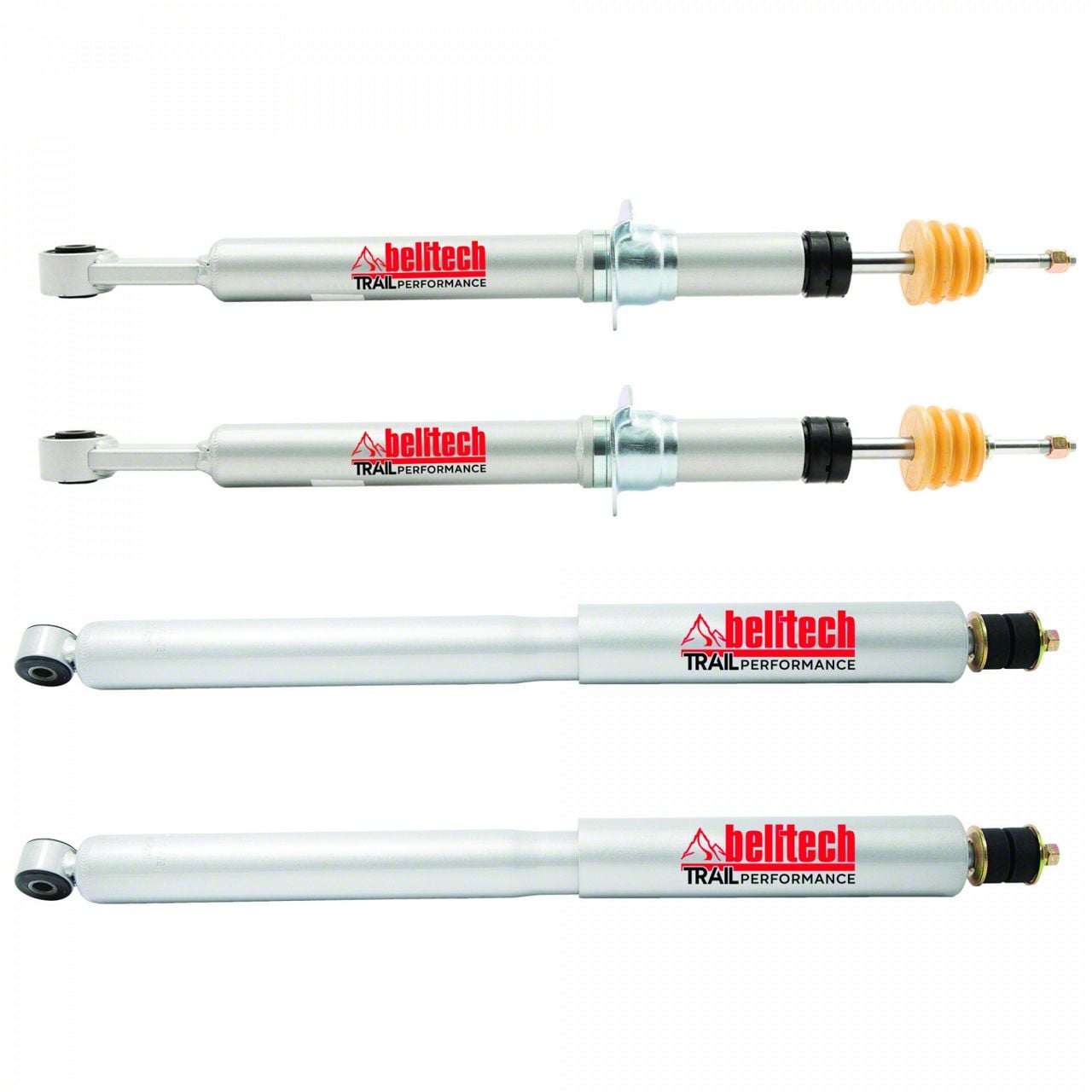 Optimized Lift Performance. The Belltech Trail Performance Front Struts and Rear Shocks are engineered for vehicles with a 4 to 6-inch front lift and a 4-inch rear lift, providing enhanced performance and control. Featuring a twin-tube design, these components are specifically tuned to offer superior handling and stability, making them ideal for off-road adventures and daily driving.