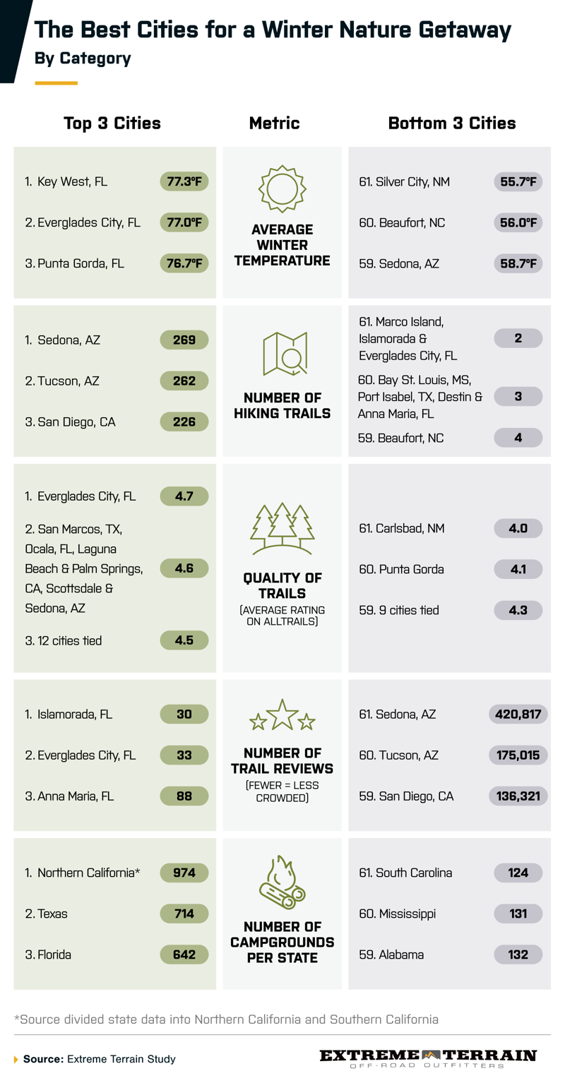 If holiday crowds aren't your thing, a winter escape in nature might be exactly what you need. Across the country, dozens of warm-weather destinations offer quiet trails, mild temps, and wide-open spaces to reset and explore. To find the best getaways for hiking and camping, we compared 61 U.S. cities that stay comfortable through the winter and offer easy access to outdoor adventure.