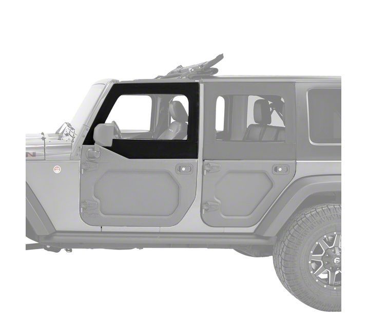 Application. The Bestop Front Upper Core Doors in Black Twill fit 2007 to 2018 Jeep Wrangler JK models.