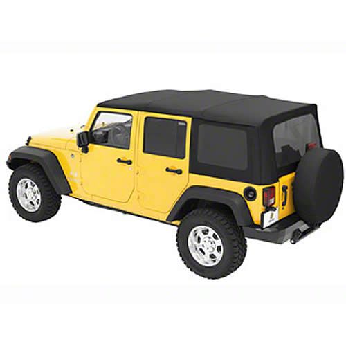 Enhanced Quality. The JK Jeep Wrangler sailcloth adheres to factory-original specifications. Reinforcements keep the sailcloth in place around the rear corners. This 4-door Wrangler soft top retains its shape for long and features tinted windows to reduce glare. Complete with black diamond fabric and tinted rear and side windows, this replacement top will require factory hardware for installation.