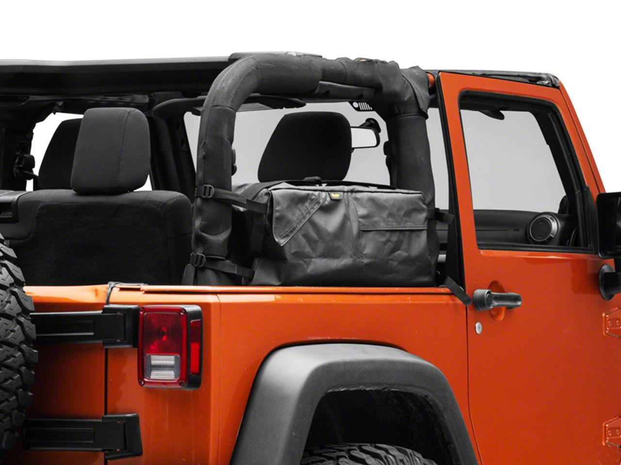 Convenient Storage Option. Especially in two-door configurations, Jeep JKs have relatively limited available interior space for cargo, supplies, and goods; queue Bestop’s RoughRider Saddle Bag. The RoughRider Saddle Bag mounts to the factory sport bar above the rear wheel well and contains a series of easy-to-access storage pockets, ideal for gear and tools.