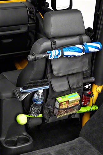 The RoughRider Seat Back Organizer is an all custom designed to exactly fit Wranglers, and made with our diamond-point fabric so it's tough, and it matches the top. Requires a seat with a headrest to attach.