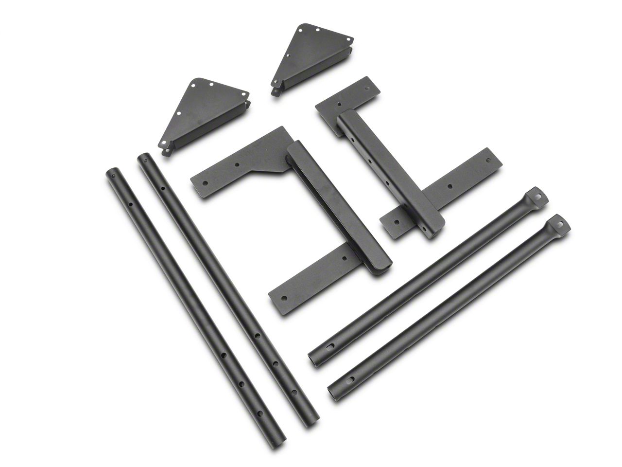 Installation. This Jeep Wrangler tailgate rack bracket can be easily attached to the tailgate using factory holes and included channel brackets without need for installation. It features built-in eye-bolts to anchor tie-down straps and cargo nets.