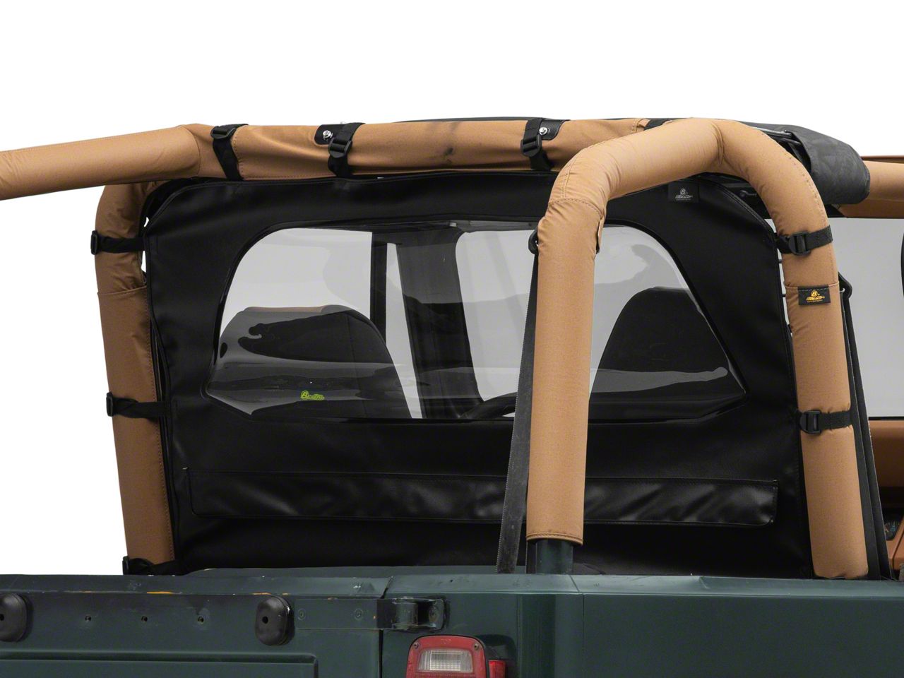 Retains Visibility. To maintain complete visibility of the rear of your Jeep, the Bestop Windjammer features an integrated, transparent, soft plastic window. This window ensures that your visibility is not limited while driving for proper safety.Â