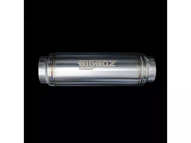 Enhanced Sound and Performance. Upgrade your vehicle's exhaust system with the Bigboz Exhaust 4 Performance Muffler. With a 2.50-inch inlet and 2.50-inch outlet, this muffler creates adequate healthy backpressure for optimal engine performance. The aggressive and superior sound produced by the muffler is sure to turn heads and make a statement on the road. It has a 304 stainless steel construction and is fully TIG-welded to ensure durability and longevity, while the laser-engraved Bigboz Exhaust logo adds a touch of style. Proudly manufactured in the USA, this muffler is the perfect combination of function and form.