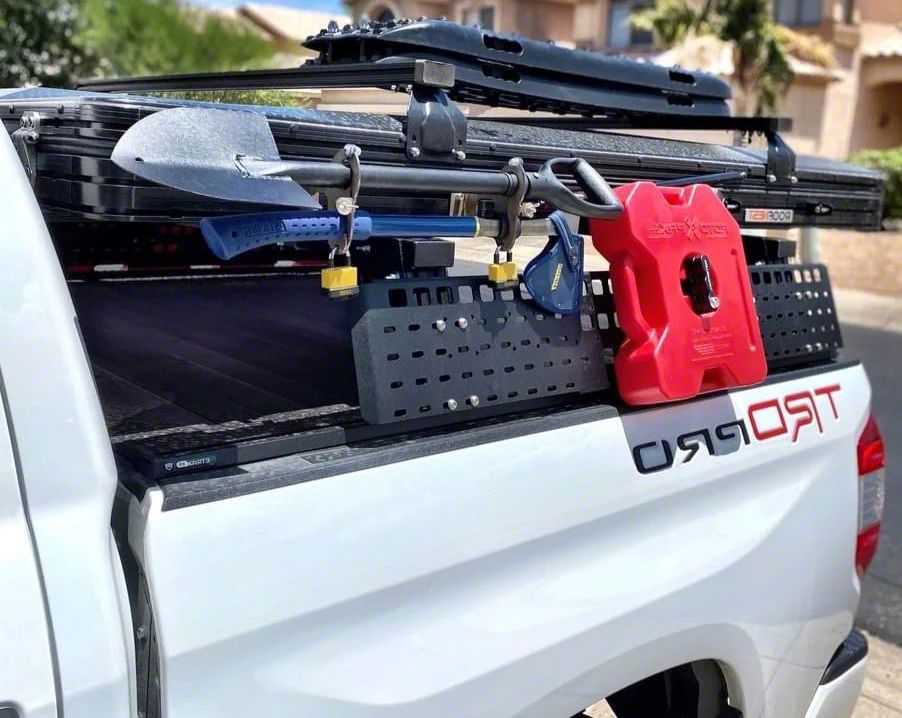 Versatile Gear Mount. The BillieBars Bed Bars MOLLE Panel Kit delivers tactical versatility and rugged utility for organizing and securing your gear. Designed for use with retractable bed covers, this MOLLE panel system offers a practical mounting solution for recovery boards, Rotopax, high-lift jacks, shovels, and more. With its modular design and integrated T-slots, this kit transforms your truck bed into a fully functional storage and accessory platform.