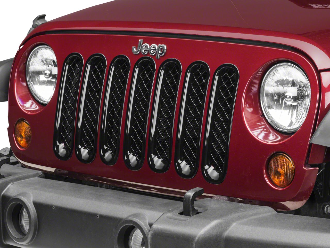 Application. The 7-Piece Black Mesh Grille Insert in black will fit all 2007-2018 Jeep Wrangler JK vehicles.