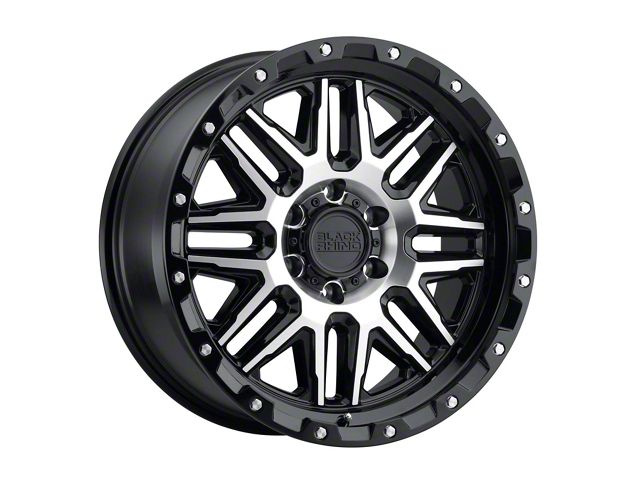 Black Rhino Alamo Gloss Black Machined 6-Lug Wheel; 20x9; -18mm Offset. The Black Rhino Alamo Gloss Black Machined 6-Lug Wheel offers a striking balance of style and refinement. Its unique design accentuates the vehicle's aesthetic, while the premium construction underscores its robust nature. This wheel is a perfect choice for those seeking both elegance and a strong visual statement.