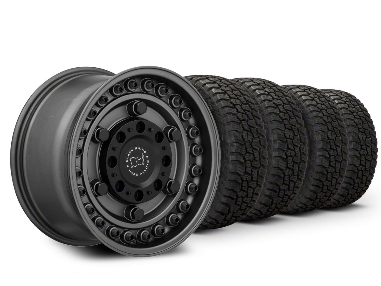 Gunblack Black Rhino Armory Wheel. Black Rhino's Armory Series Wheel features a military-style inspired design with simulated hardware accents around the face for rugged good looks. This Wheel is completed in a high quality, clear coated, gunblack finish for an aggressive appearance that can withstand the hazards of everyday driving - including road chips and pitting.