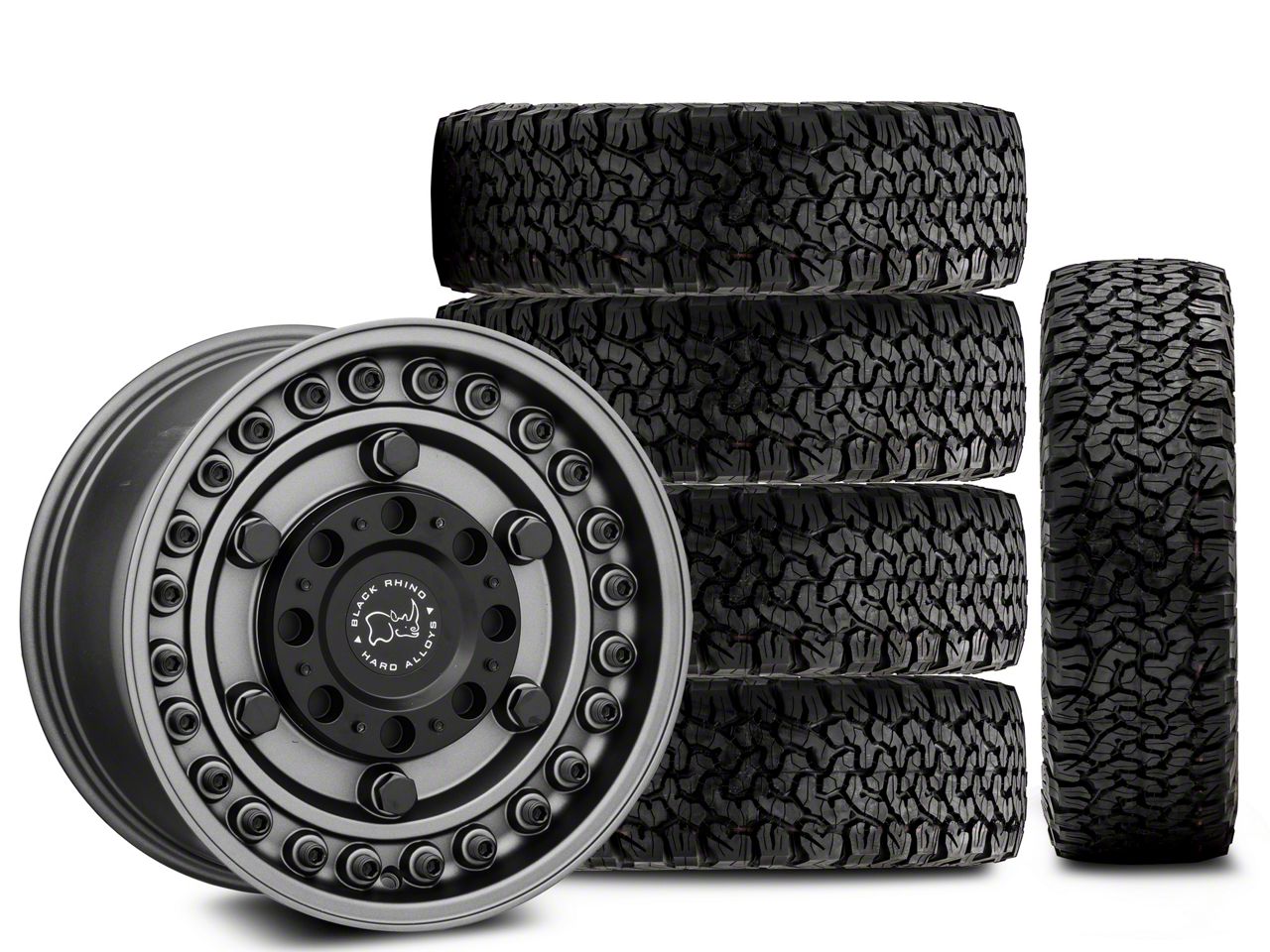 Mounted and Balanced Wheel and Tire Kit. This wheel and tire combo kit features (5) 17x9 Black Rhino Armory Gunblack Wheels and (5) BF Goodrich All-Terrain T/A KO 315/70R17 tires that have been put together into an easy to buy kit that arrives to your door already mounted and balanced ready to be installed on your vehicle.