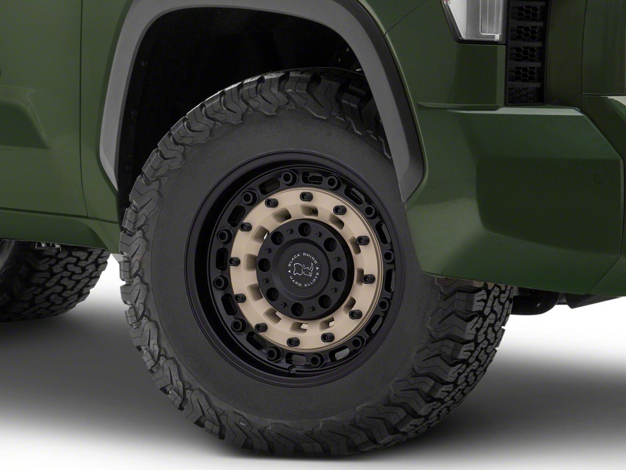 Application. This Black Rhino Arsenal Sand on Black 6-Lug Wheel; 18x9.5; -18mm Offset, with a backspace of 4.292 Inch, 109.1mm and bolt pattern of 6 x 139.7mm (6 x 5.5-Inch), ensures optimal alignment and driving stability. It is designed to fit 2022-2026 Tundra models. Sold individually.