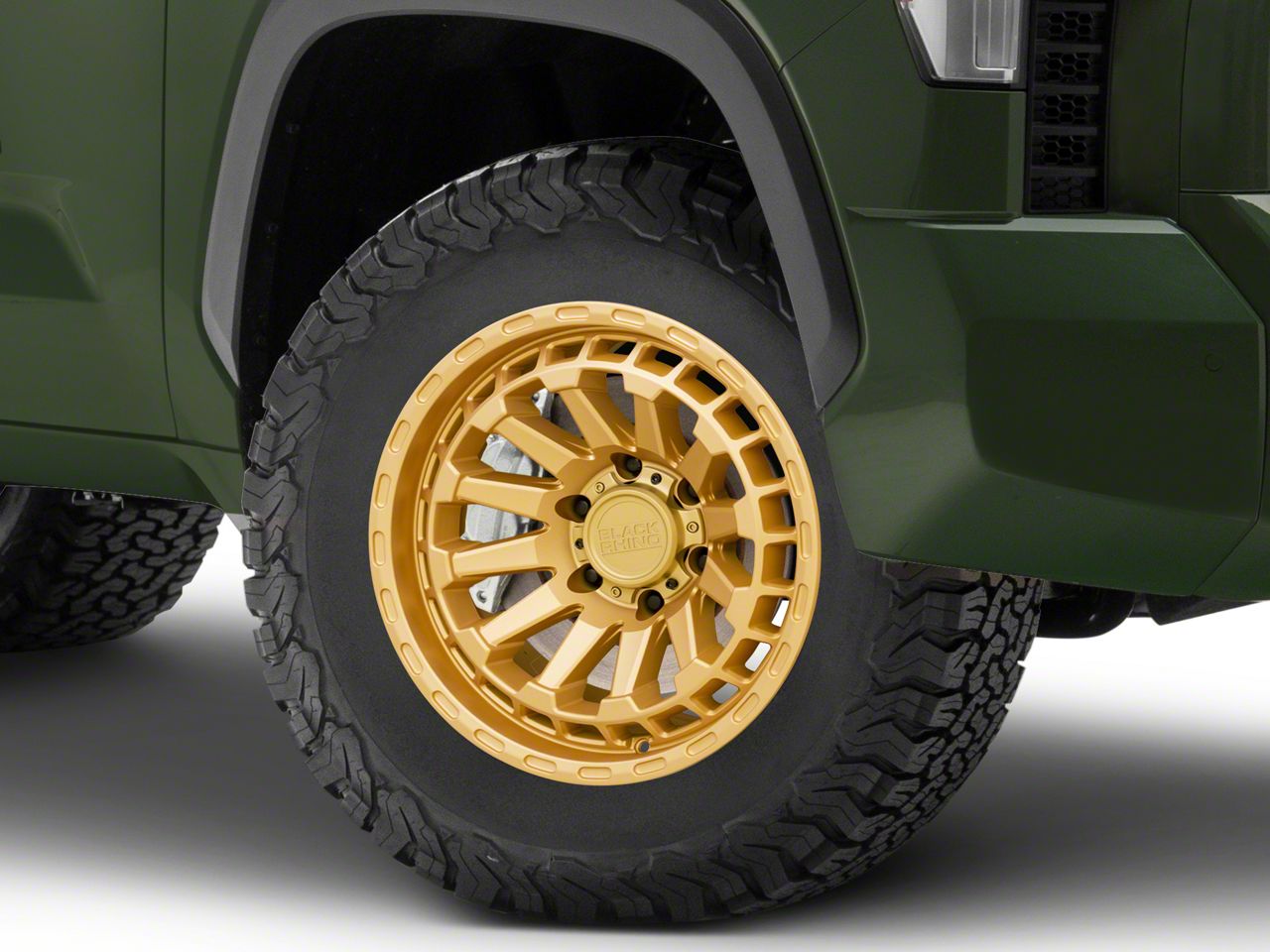 Application. This Black Rhino Raid Gold 6-Lug Wheel; 18x9.5; 12mm Offset with a backspace of 5.723 Inch, 145.4mm; and bolt pattern of 6 x 139.7mm (6 x 5.5-Inch) contributes to impeccable alignment and driving stability. Designed to fit 2022-2026 Tundra models, sold individually.