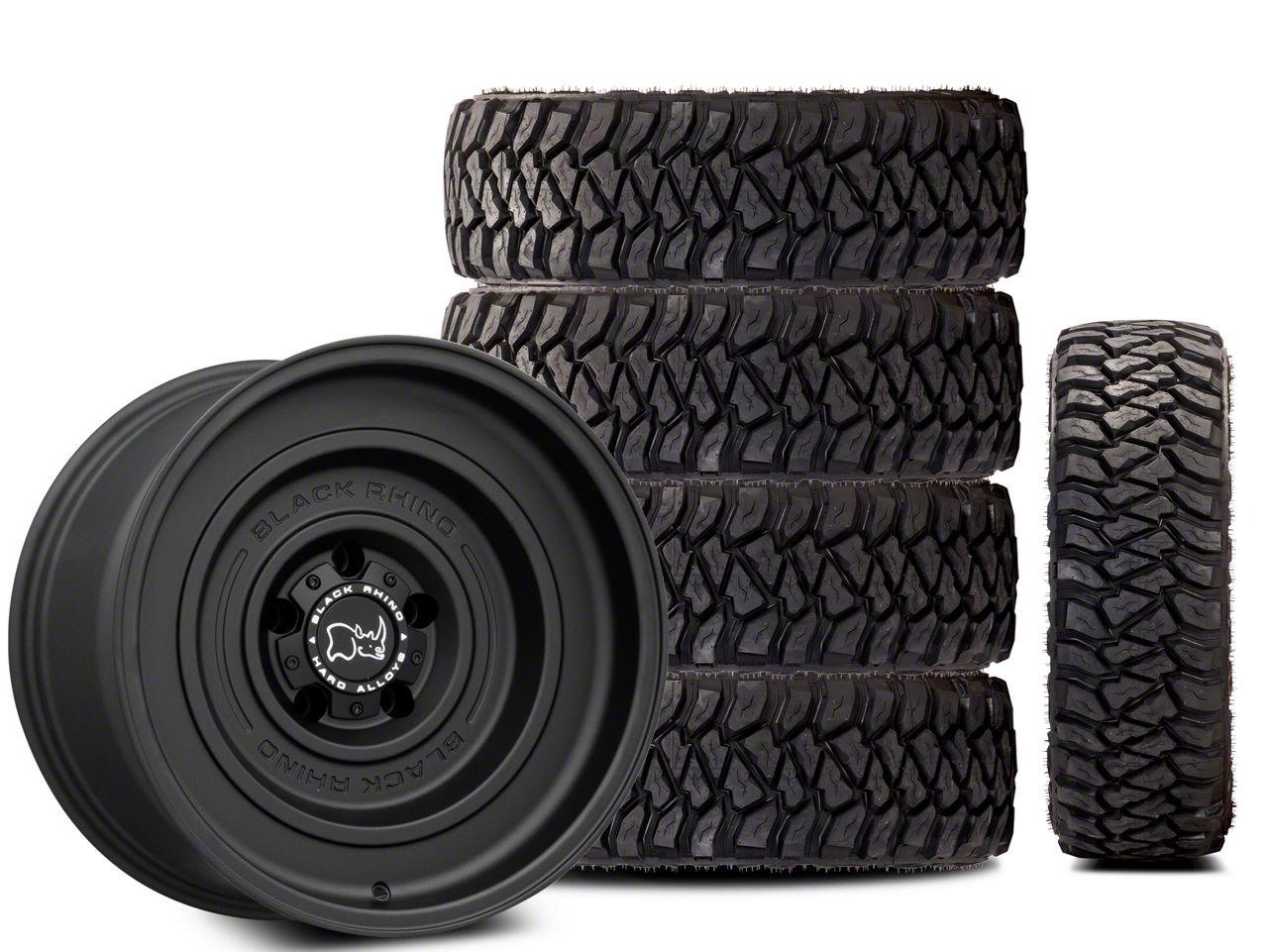 Mounted and Balanced Wheel and Tire Kit. This wheel and tire combo kit features (5) 17x9.5 Black Rhino Solid Matte Black Wheels and (5) Mickey Thompson Baja Legend MTZ Mud-Terrain 35" - 35x12.50R17 tires that have been put together into an easy to buy kit that arrives to your door already mounted and balanced ready to be installed on your vehicle.