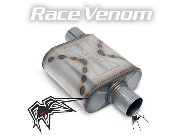Construction and Appearance. Crafted from durable 409 stainless steel, the Race Venom Series muffler features a compact 9 x 9 x 4-inch body with a 3.50-inch inlet and outlet for maximum flow. It’s expertly welded for strength and built with a bi-directional design to simplify fitment and enhance versatility.