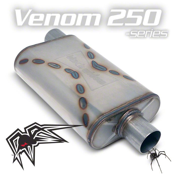 Body size: 14" x 9" x 4"Material: 409 Stainless SteelInside Diameter: 3"Bi-DirectionalBlack Widow Venom 250-series mufflers set the standard for development of our 300-series, Race Venom and Widowmaker mufflers. Made out of quality brushed stainless steel and a patent pending hourglass design, the Venom 250-series produces Black Widow's signature aggressive and clean tone – without a harsh drone sound. All Venom mufflers are backed by our Lifetime Limited Warranty. Go to Warranty for details.NOTE: Because Black Widow mufflers are universal and not a direct OEM fit, we recommend installation by a qualified muffler shop.