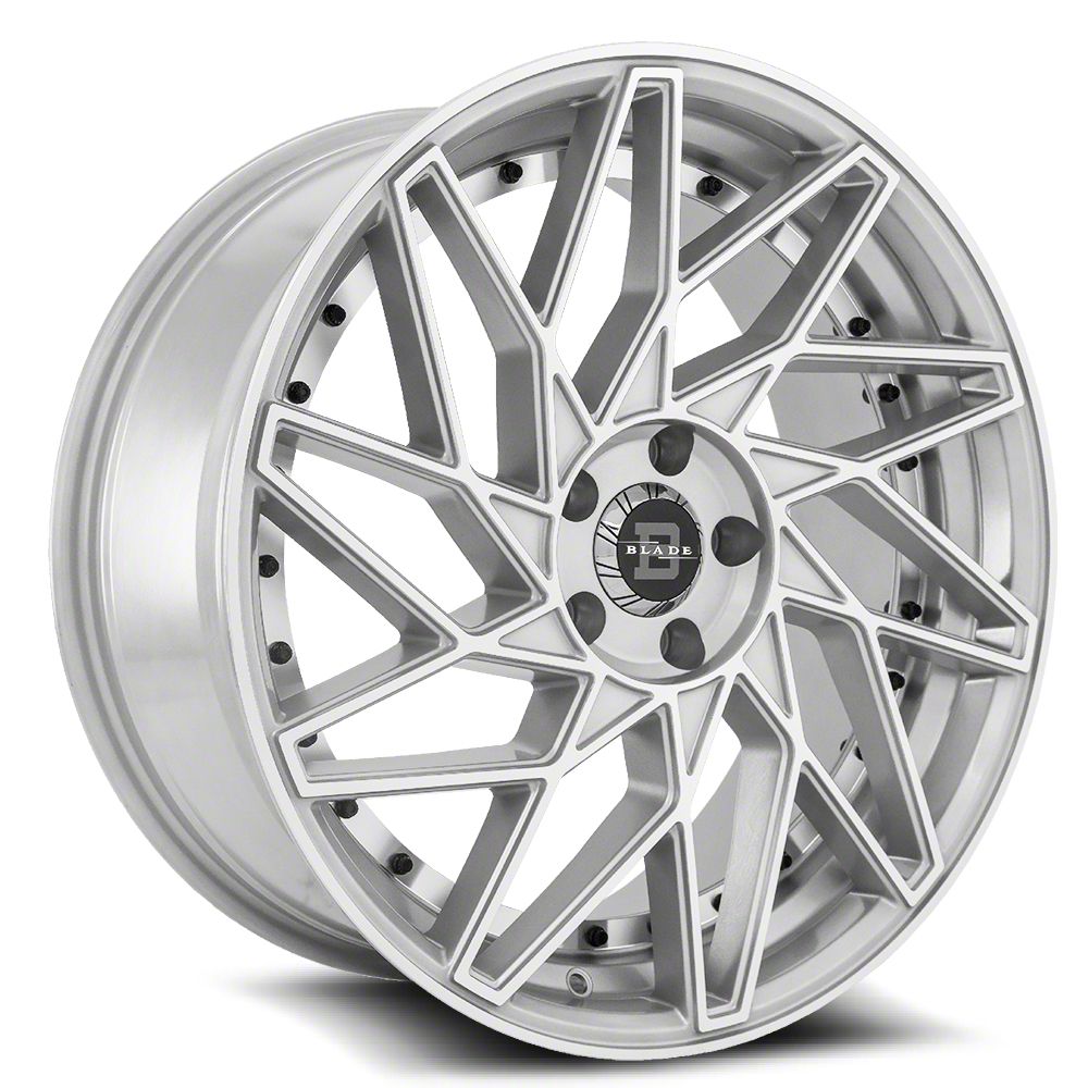 Blade Luxury RT-455 Venzo Silver and Machined 5-Lug Wheel; 24x9; 35mm Offset is a visually striking choice, offering a combination of rugged durability and modern styling. Its design complements off-road and sporty vehicles alike, enhancing the overall aesthetic appeal.