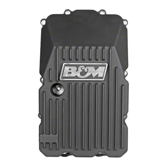 Finned A356-T6 Aluminum Construction. B&M manufactured this deep transmission pan from A356-T6 aluminum, cast with thick internal and external fins for additional cooling effect. It’s completed with a black anodized finish for extra protection against corrosion and other elements.