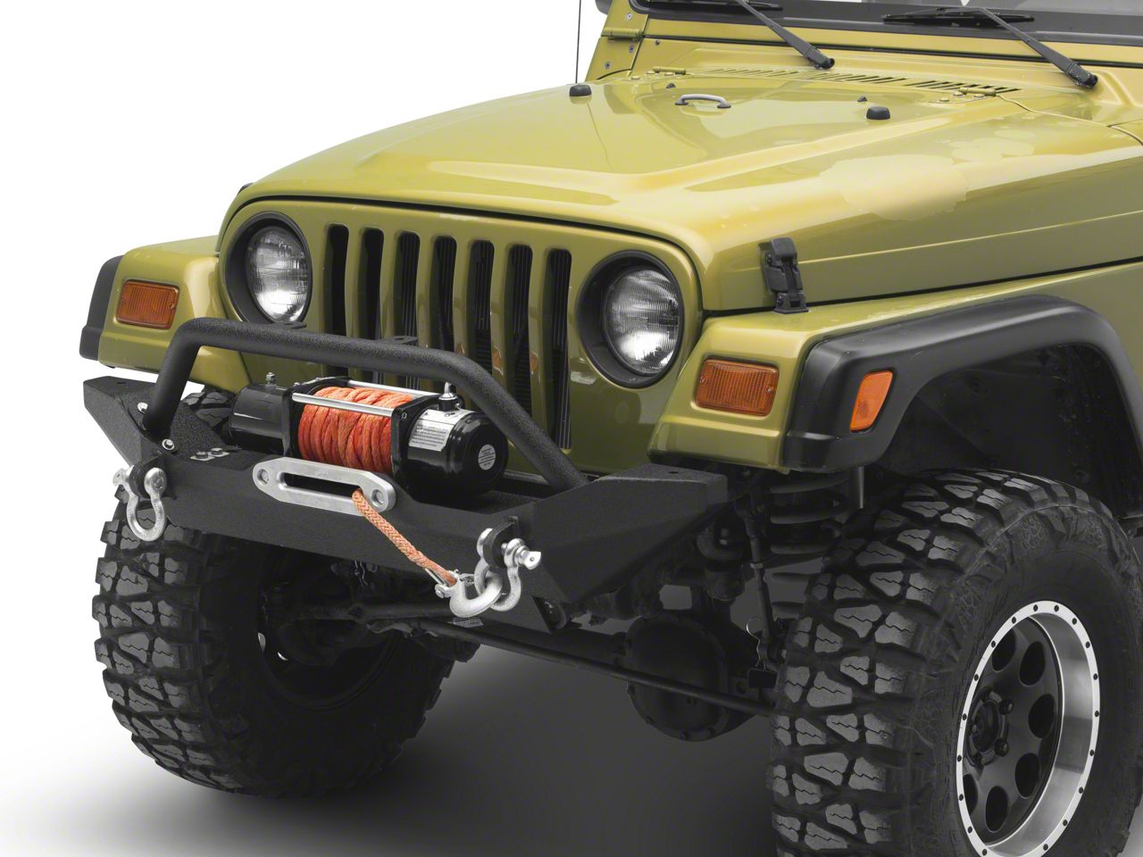 New formed front bumper for Jeep TJ and YJ. This new bumper is designed with the enthusiast in mind. The 1/4" thick integrated winch plate with the footprint for most popular winches. The rest of the bumper is manufactured from 3/16" steel plate. Reinforced bumper wings are designed to take the abuse other bumpers can't. Bolt on hoop for added protection for the winch, comes with 2 light tabs for off road lights. Two additional light mounting points on the wings of the bumper. Bumper wings tapper up towards the fender for maximum approach angles at the tire while still providing plenty of protection to the vehicle. A skid plate for the steering box is included. Simple bolt on installation, no drilling required. features Body Armor's new dual process black powder coat finish for maximum corrosion resistance.