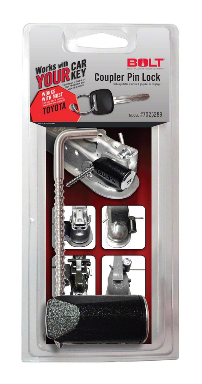 Opens with your vehicle ignition key. Fits couplers from 1/2 in. to 3 3/8 In. and any size in between. Stainless steel pin. Lock slides back and forth along pin for ease of use. 1/8 in. incremental adjustments allows for a snug fit. Weather proof. Plate tumbler sidebar to prevent picking and bumping. Stainless steel lock shutter to keep out dirt and moisture. Limited lifetime warranty.