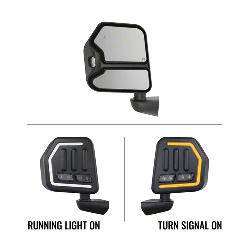 Construction and Appearance. Each mirror is manufactured using high-quality materials to ensure strength and durability over time. The construction meets or exceeds OEM specifications, delivering OE-like reliability while incorporating modern lighting technology. Featuring a sleek finish with integrated switchback white running lights and amber sequential turn signals, these mirrors add a sharp and functional appearance to your vehicle.