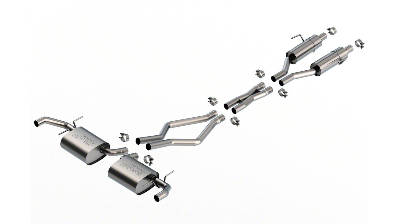 Construction and Appearance. Constructed in the USA from premium 2.25-inch T-304 stainless steel tubing, this system is engineered for durability and corrosion resistance. The polished chrome finish adds a high-end aesthetic, while the true dual system and X-pipe assembly help balance exhaust pulses for improved tone and smoother flow. Borla’s precision-built components ensure a long-lasting, tight-sealing fit.