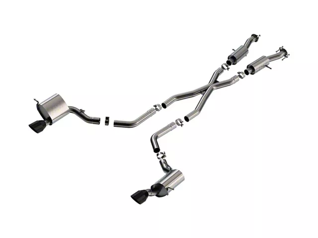 Sturdy Structure. The Borla S-Type Cat-Back Exhaust with Ceramic Black Tips is a high-performance exhaust system designed to elevate your vehicle's power and aesthetics. Crafted from durable 304 stainless steel, this exhaust system is built to endure the rigors of the road while resisting rust and corrosion, ensuring long-lasting performance and a sleek look. Its 2.75-inch mandrel-bent tubing optimizes exhaust flow, reducing back pressure and unlocking gains in both horsepower and torque.