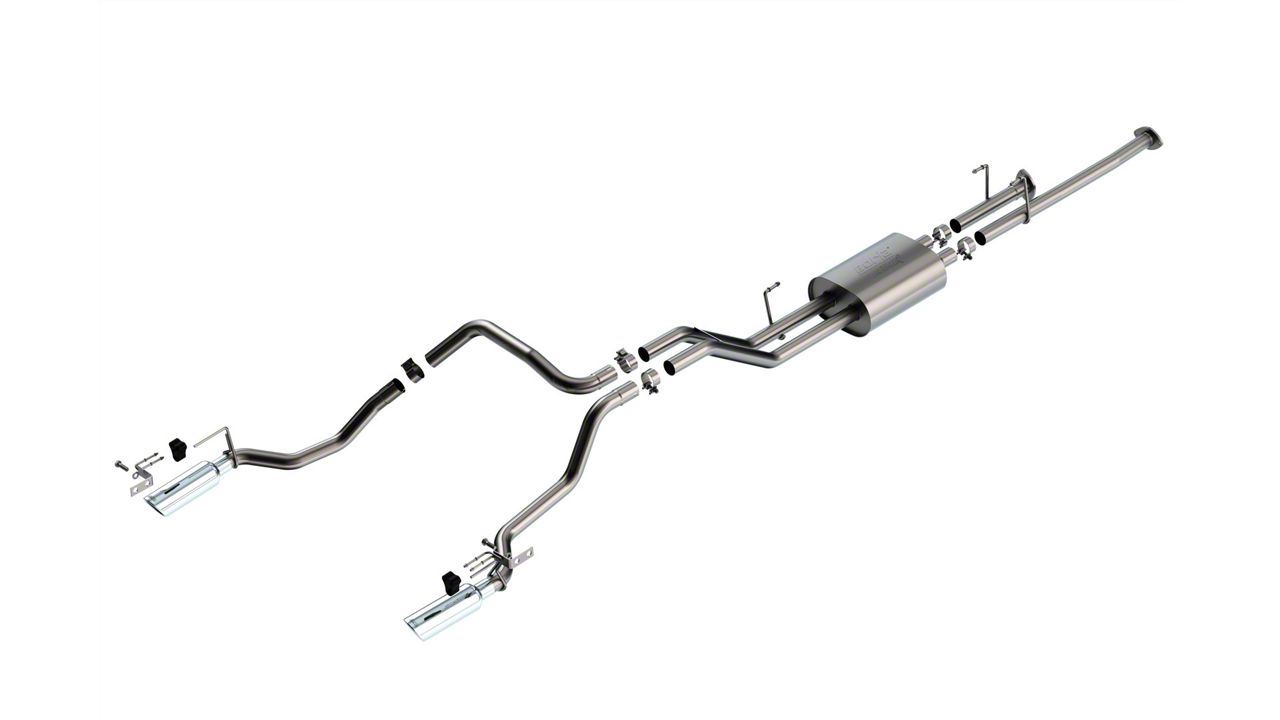 This BORLA® 2.25" diameter Cat-Back™ system is a True Dual, split side exit, with single 4" round bright chrome on T-304 stainless steel tips on each tail pipe. This system gives the Tundra a great look, pure performance V-8 growl, and a nice performance kick. The muffler contains an internal H-Pipe for increased performance and improved sound. The system delivers the classic ATAK sound with no drone inside the vehicle. The full dual system even weighs less than the factory single system, thanks to the lightweight T-304 stainless steel fabrication and, not surprisingly, out flows the stock exhaust. It even exhibits better fuel economy numbers which is nice for a big truck. BORLA® Cat-Back™ & Axle-Back exhaust systems feature patented straight-through and multi-core technology to unleash hidden horsepower. Increased exhaust velocity adds power, driving excitement, fuel economy, and the distinctive BORLA® Sound of Power respected by motoring enthusiasts everywhere.