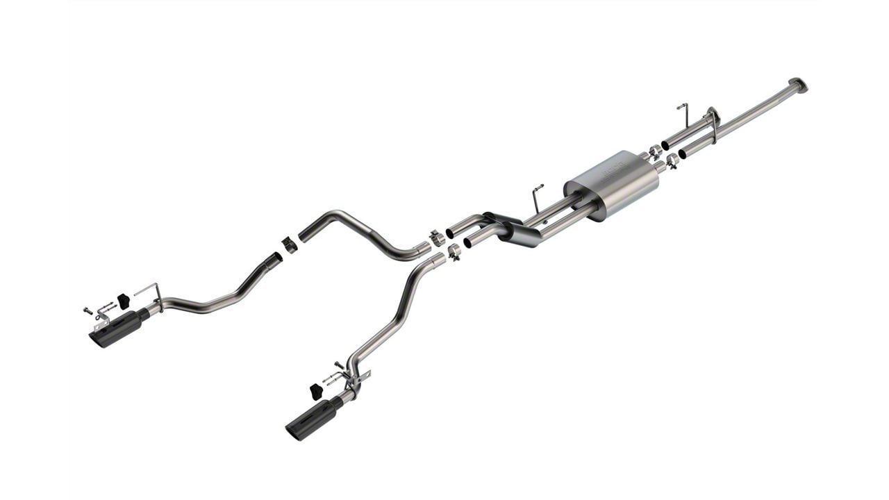 This BORLA® 2.25" diameter Cat-Back™ system is a True Dual, split side exit, with single 4" round black chrome on T-304 stainless steel tips on each tail pipe. This system gives the Tundra a great look, pure performance V-8 growl, and a nice performance kick. The muffler contains an internal H-Pipe for increased performance and improved sound. The system delivers the classic S-Type sound with no drone inside the vehicle. The full dual system even weighs less than the factory single system, thanks to the lightweight T-304 stainless steel fabrication and, not surprisingly, out flows the stock exhaust. It even exhibits better fuel economy numbers which is nice for a big truck. BORLA® Cat-Back™ & Axle-Back exhaust systems feature patented straight-through and multi-core technology to unleash hidden horsepower. Increased exhaust velocity adds power, driving excitement, fuel economy, and the distinctive BORLA® Sound of Power respected by motoring enthusiasts everywhere.