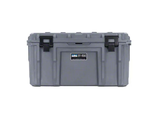 Highly-Durable Case. Crafted from rotomolded polyethylene HDPE in a sleek light grey, the Borne Off-Road Hard Case exudes both style and strength. Its military-grade lid seal and sturdy steel latches provide enhanced security and protection against the elements. Designed for durability, this case is stackable and crush-proof up to an impressive 2,000 pounds, ensuring your belongings stay safe even in rugged conditions.