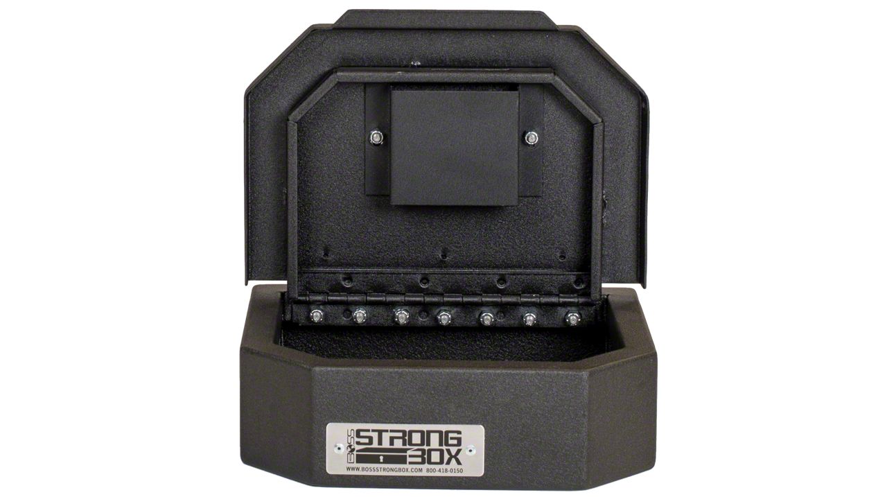 Construction and Appearance. Crafted from 16-gauge cold rolled steel, the BOSS StrongBox delivers impressive strength in a small form factor. It features a double-layered steel lid for added durability, along with a shielded lock cam and a reinforced heavy-duty hinge that help prevent forced entry. The wrinkled black powder-coat finish provides a clean, matte look while resisting scratches and corrosion.