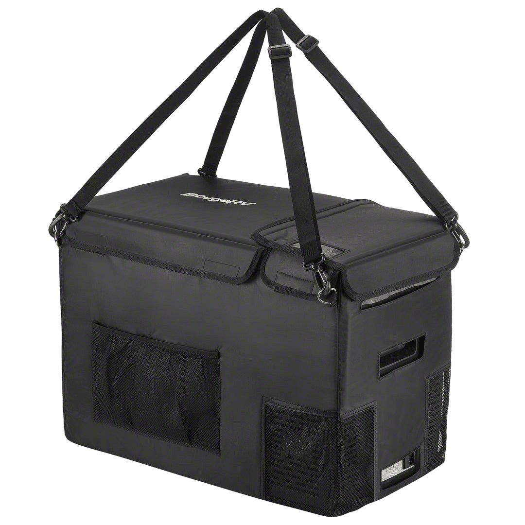 Protects From Scratches, Bumps, and Sunlight Damage: It protects your fridge from getting scratched and damaged. Keep your freezer clean and brand new.Insulated Interior Layer Helps Saving Power: The carrying case also keeps your refrigerator insulated if you find yourself in the middle of nowhere on a hot summer day. It is very helpful for keeping the fridge cool which means less power is drawn from your AC outlet and external battery.Fits Like A Glove: Perfectly fits BougeRV CRPRO 30 Quart Car Refrigerator(Black and Grey), easy to put in and put out. Without removing the fridge from the carrying case, you can simply lift the flap and use your fridge.3 Layers protective materials: Durable and weatherproof 600D Oxford Cloth: prevent sunlight, dust, scratch, and collision.Thickened pearl cotton: sufficient thickness for insulation. Inner aluminum film: heat insulation, easy to clean.Excellent Ventilation and Extra Storage Space: This carrying case features space for air flowing and extra side pockets for AC/DC power cords and the 220WH Portable Power Station. You can also regulate the temp through the transparent area on the case's surface.