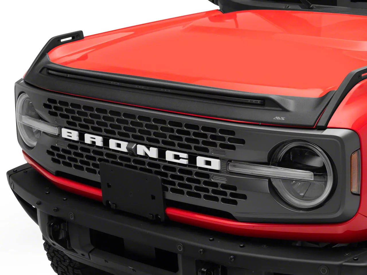 Lightning and Protection. Protect your hood from chips and scratches with this Aeroskin LightShield Hood Protector; Black fastened to your Bronco. Not only is it a strong shield against debris and accidents, it also sports LED marker lights that enhance your road side visibility. With this lighting your front end, your can expect lesser bumps and scratches on your metal work as well as a renewed look to the face of your mean machine.