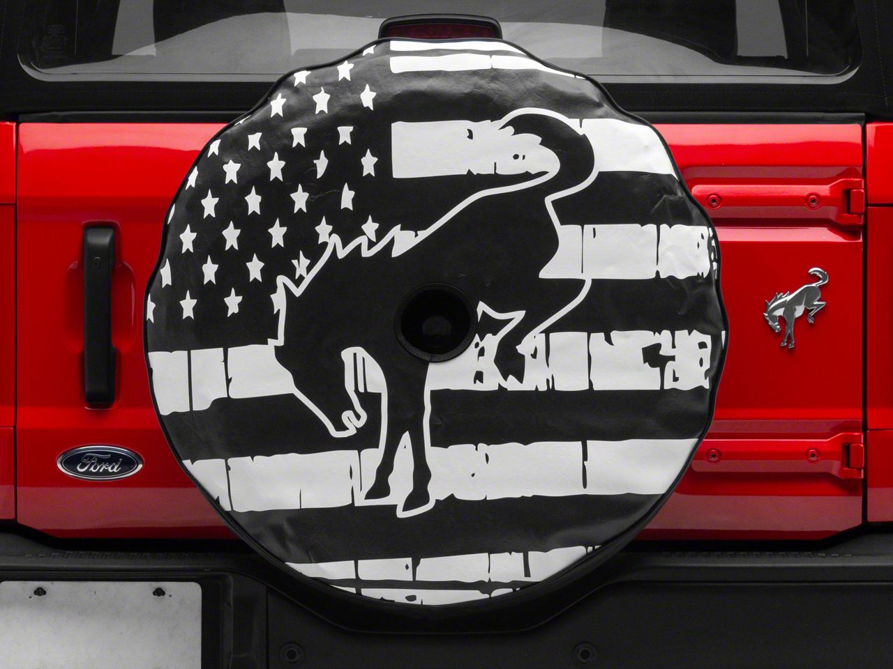Application. This American Flag with Bronco Horse Spare Tire Cover is designed to fit 2021-2026 Ford Bronco models.