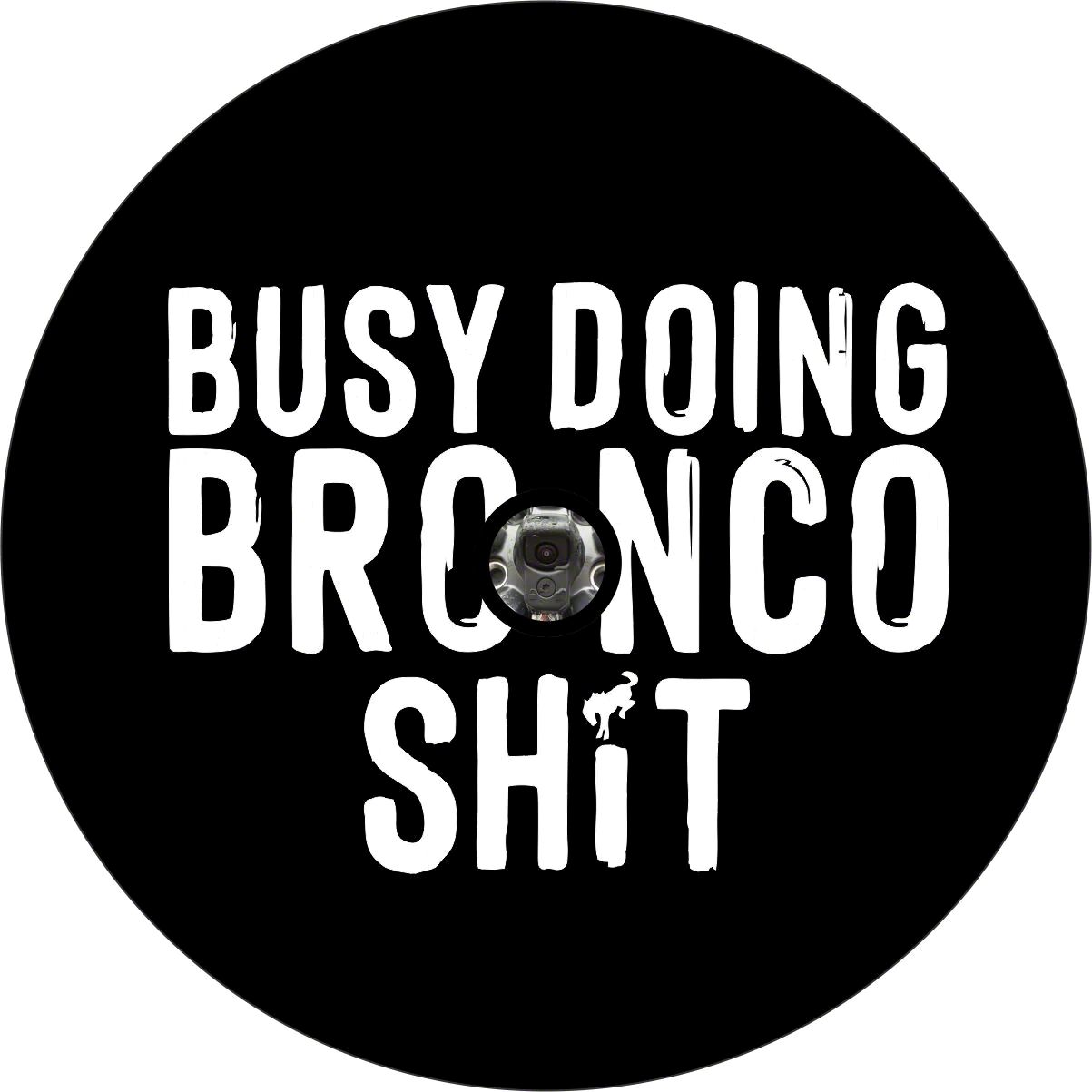 Sassy Design. Made for the Ford Bronco, this Spare Tire Cover is made in the USA and has a matte black finish. Built with a camera cutout, this spare tire cover has a UV-inked Busy Doing Bronco Sh’t text design on high-grade marine-grade vinyl.