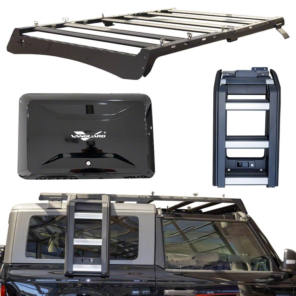 Application. This Craftsmen Roof Rack With Deployable Ladder and Side-Mounted Gear Carrier fits 2021–2026 Ford Bronco 2-Door models with a hard top.