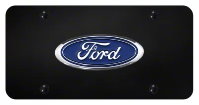 Construction and Appearance. Made in the USA, this License Plate is made from stainless steel with a rugged black finish. The Ford logo with blue background is written in chrome across the middle and it comes with vehicle-specific hardware.