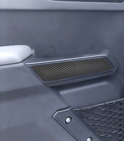 Luxurious and Sporty Interior Upgrade. The Front Side Door Pull Handle Overlays elevate your Bronco's interior with a raw carbon fiber finish, adding a luxurious and sporty touch. These overlays are custom-made to perfectly fit over the factory door pull handles, enhancing the aesthetics of your cabin.
