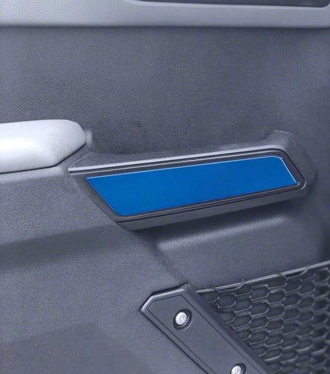 Elevate Your Car's Interior. Transform the interior of your vehicle with the striking Front Side Door Pull Handle Overlays in Velocity Blue. These overlays are designed to enhance the aesthetics of your car's interior, adding a vibrant and personalized touch to the door pull handles. Perfect for vehicle owners who desire to customize their car's interior, these overlays are a simple yet effective way to add a pop of color and individuality.