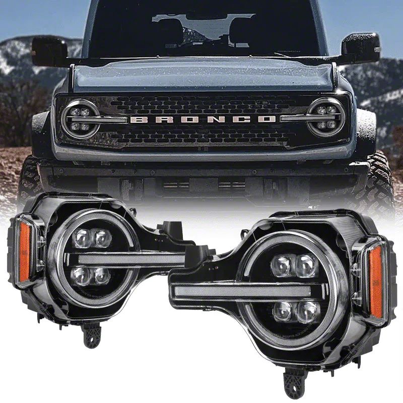Application. These Full LED Projector Headlights; Black Housing; Clear Lens fit 2021–2026 Ford Bronco models.