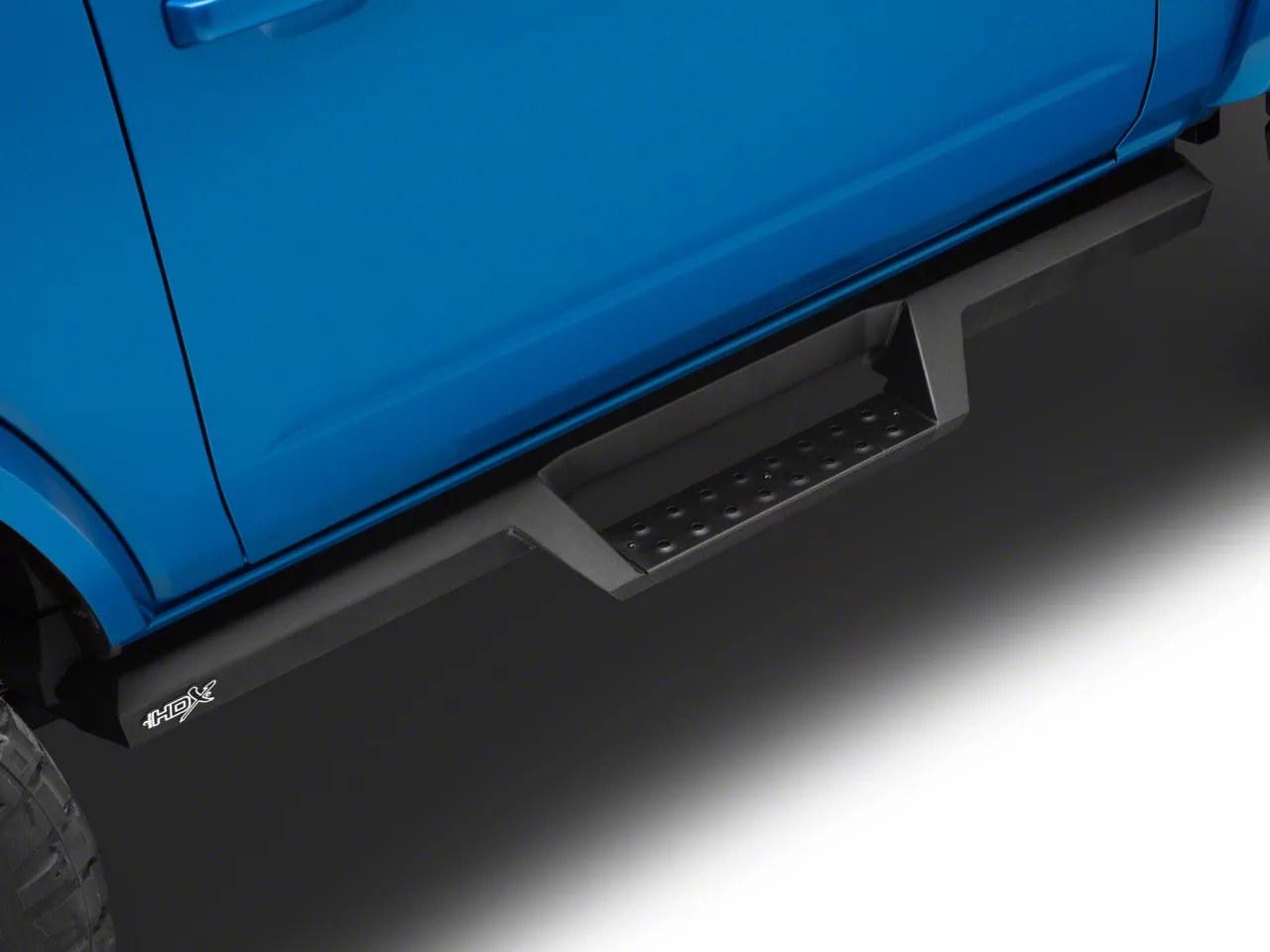 Construction and Appearance. These HDX Drop Nerf Side Step Bars are manufactured from a single piece of e-coated steel. They are finished in a rust-proof textured black powder coat to ward off corrosion while looking cool. Non-slip die-stamped steep steps feature easy-to-clean removable step plates.