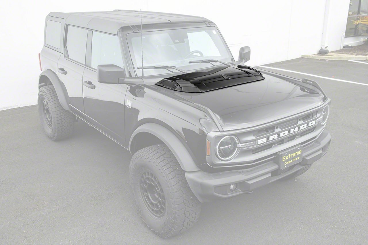 Application. Hood Scoop Cover; Glossy Black is compatible with 2022-2026 Bronco Raptor models.