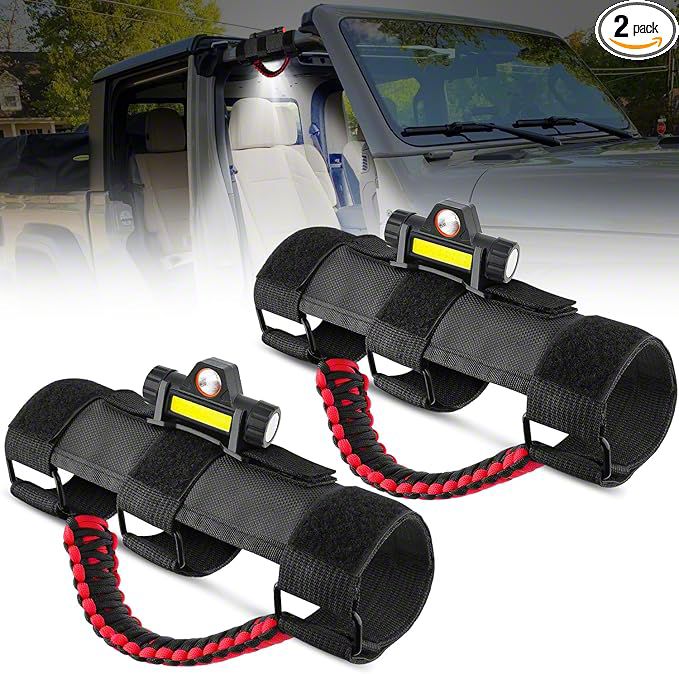 Construction and Features. The LED Dome Lights are designed for long-lasting performance and are rechargeable for convenience, offering 8-10 hours of continuous light on a single charge. The grab handles are built from thick, durable materials, providing not only a secure grip but also the strength to support up to 450 pounds. These lights feature a wireless setup, eliminating the need for complicated wiring, and making them easy to use anywhere inside or outside the vehicle.