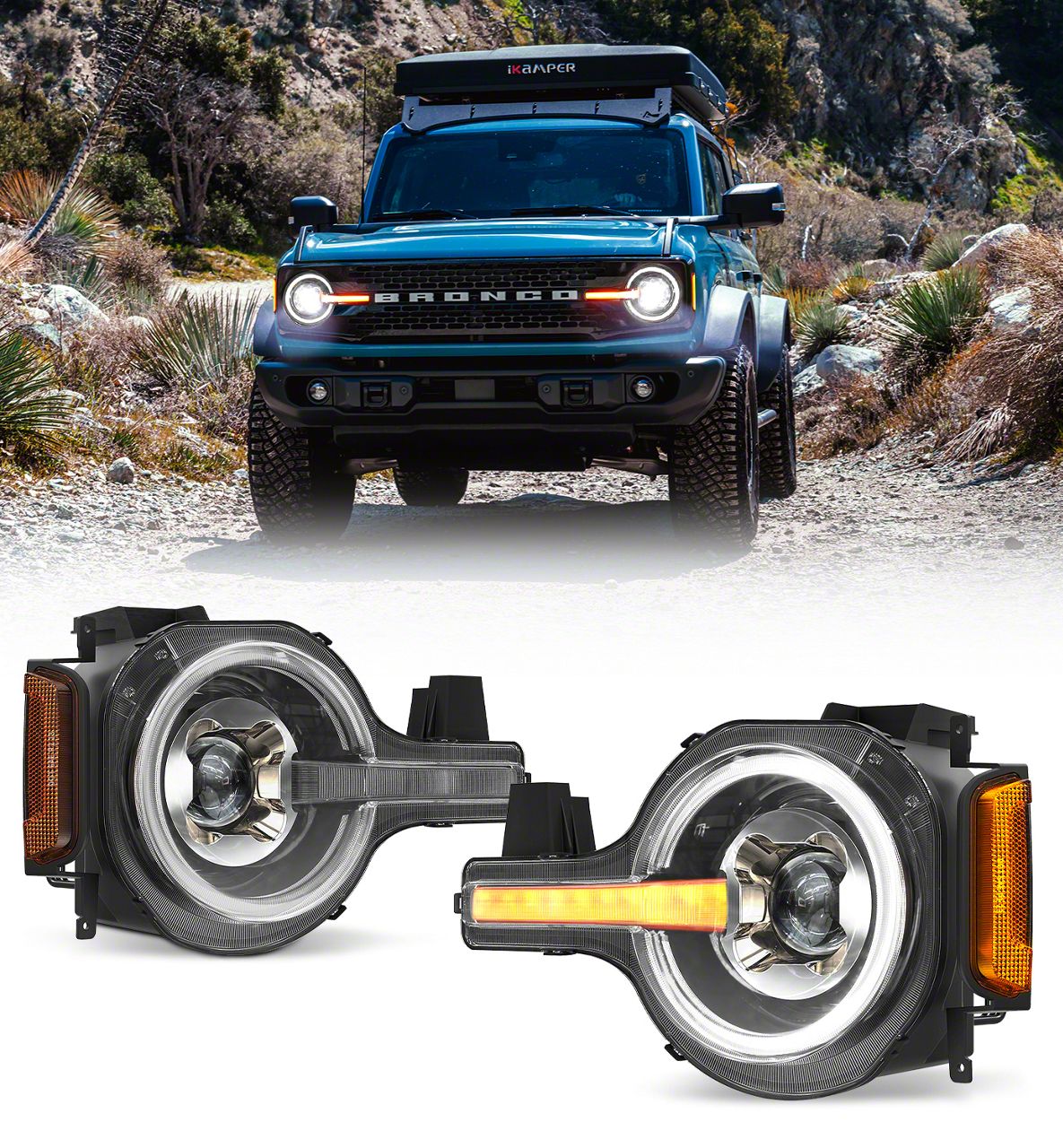 Application. The LED Headlights with White and Amber DRL and Sequential Turn Signals fit 2021-2026 Bronco models.