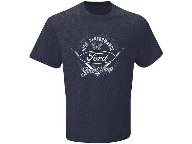 Ford Themed Graphic T-Shirt. This great looking navy blue short sleeve t-shirt is a must have for all Ford enthusiasts. Officially licensed, this graphic tee features the High Performance Ford Speed Shop logo. This T-Shirt makes the perfect gift for yourself or the fellow Ford lover in your life.