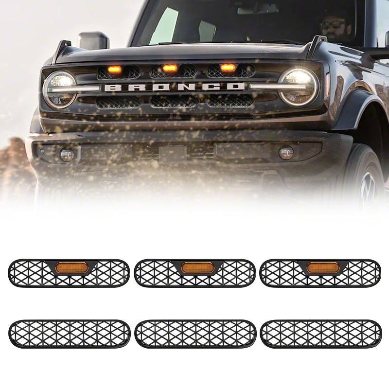 Bold Styling With Functional Lighting. The Mesh Grille Inserts with Amber Grille Lights upgrade the front-end of your 2021 to 2026 Bronco Big Bend or Outer Banks with a rugged off-road appearance and added visibility. Designed to enhance airflow while integrating amber LED lighting, these inserts are the perfect fusion of form and function.
