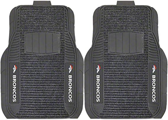 Application. These Molded Front Floor Mats with officially-licensed Denver Broncos logo feature a universal design so they will fit most makes and models of vehicles. These Mats can be trimmed to fit if necessary. Sold as a set of two Mats.